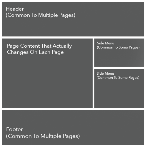 Web pages usually have many different sections. Some parts, like the header and the footer may be common to each and every page on the website. Some parts like the side menu may be common to to a few pages. There is usually one section that is unique to a particular page: the page content. Below it a pictorial representation of the same idea.