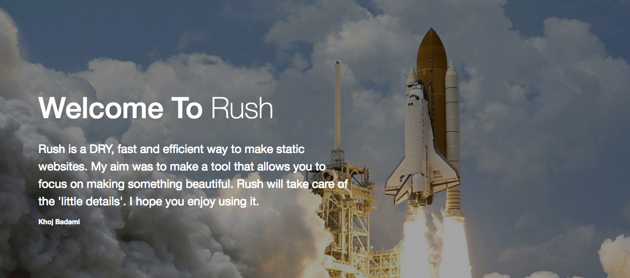 "page_header_text": "Rush is a DRY, fast and efficient way to make static websites. My aim was to make a tool that allows you to focus on making something beautiful. Rush will take care of the 'little details'. I hope you enjoy using it."